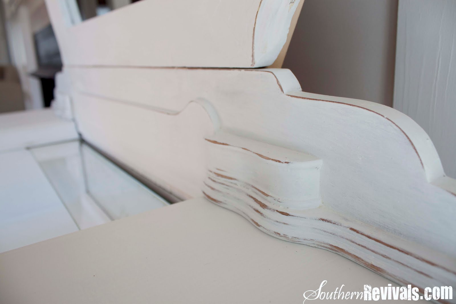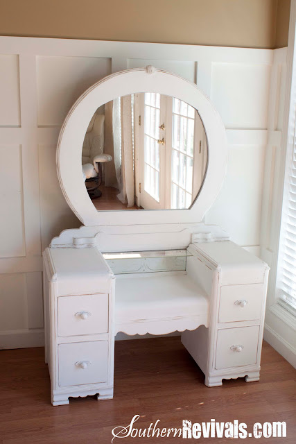 I left the original mirror and little glass shelf that came with the vanity table itself. I just cleaned it up really well with my handy dandy Fish Foam (LOVE that stuff) and it was almost as good as new. Not too new, mind you! We like those little dents and scratches here and there. After all this tells her story and we wouldn’t want to erase that.