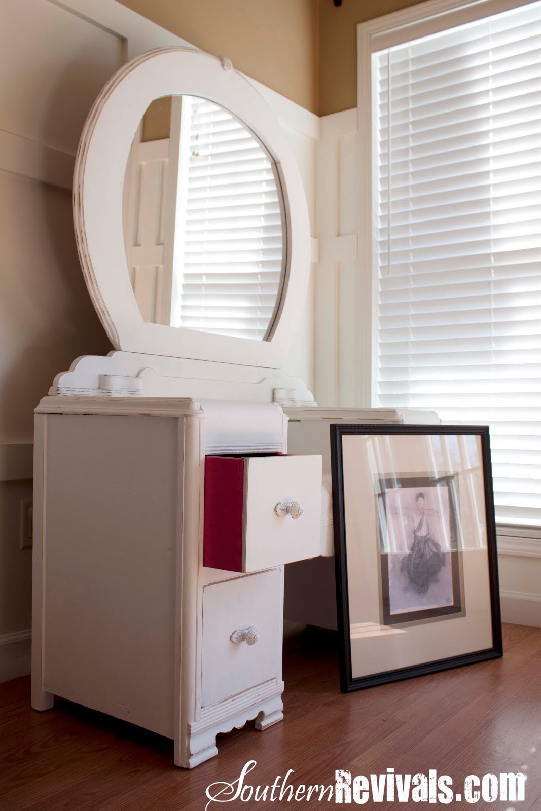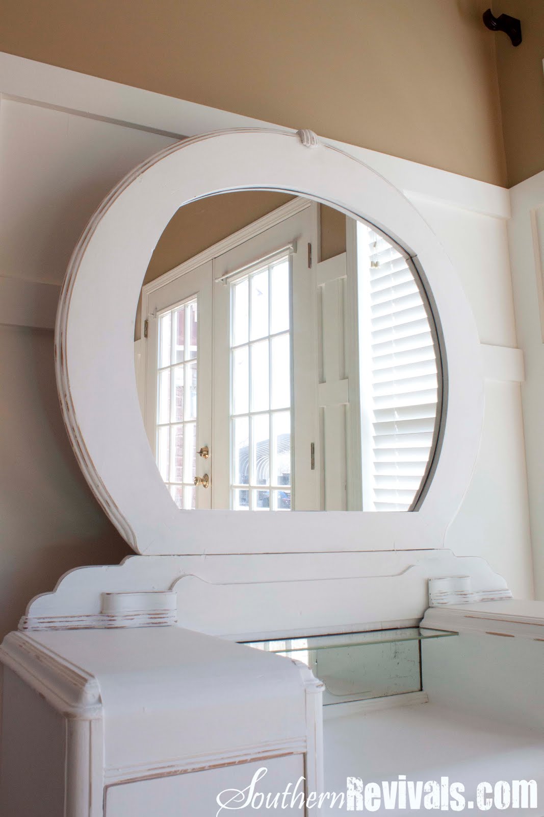 Oh man that looks like it was A LOT of work, but it looks so fantastic. I love those old vanities – and the mirror on yours is awesome!