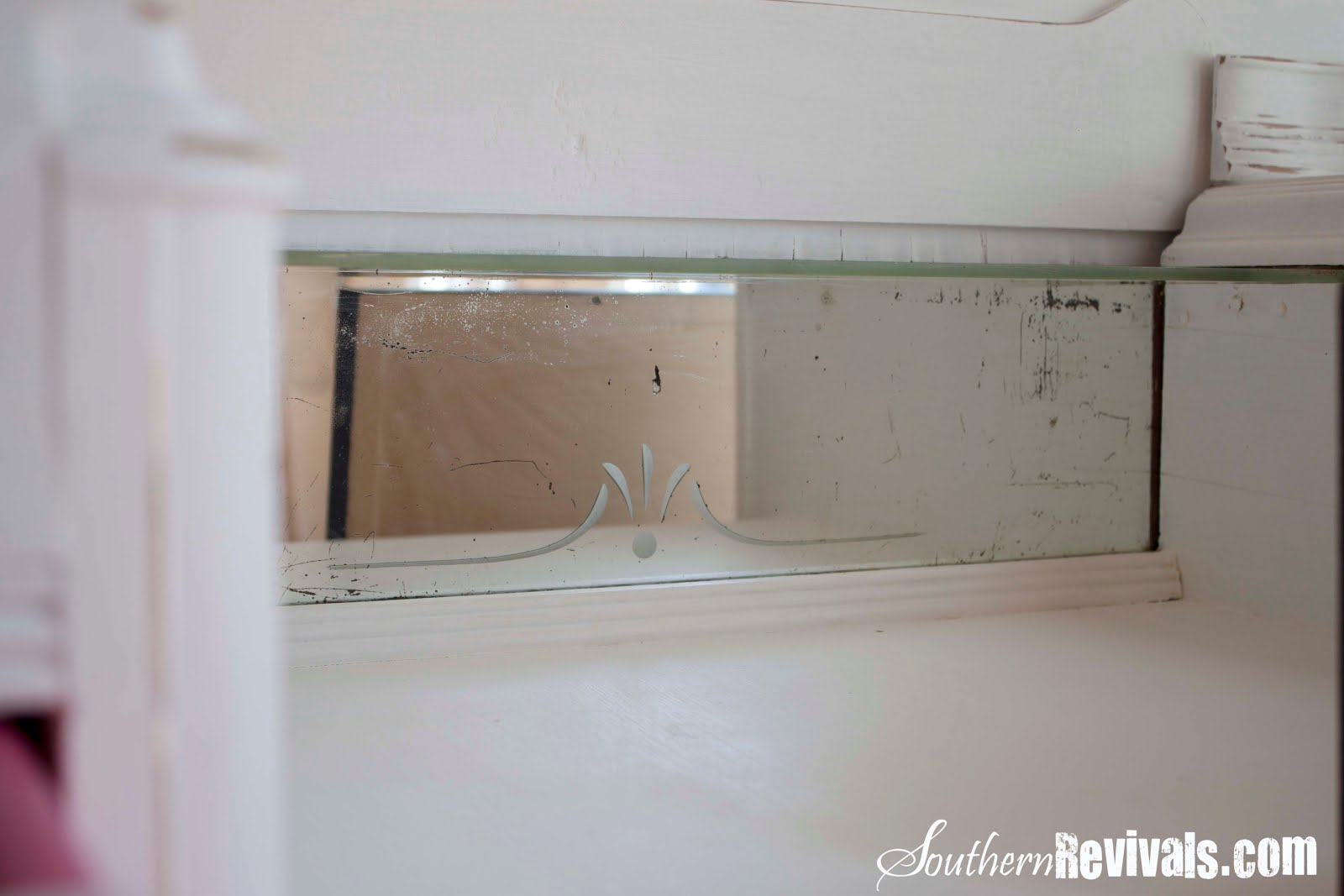 Somewhere along the way she lost her mirror. Her new yellow paint was applied over loose veneer and water had made it’s way underneath that veneer. Water, paired with a latex finish is a virtual petri dish for growing mold….and growing mold she was. Poor girl!
