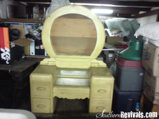 I recently revived an old vanity dresser with mirror for a client. I’m not certain on it’s age but I’m guessing the time period to be between 1930s – 1940s. It started out life with a stained wood finish and at some point got an updated yellow one.
