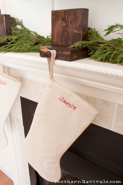 Check out these wood scrap stocking holders I made out of the leftovers from our farmtable. One of these days I will find some gold glittery deer heads or some antlers to put on the front of them. Unless I change my mind. I do that sometimes.