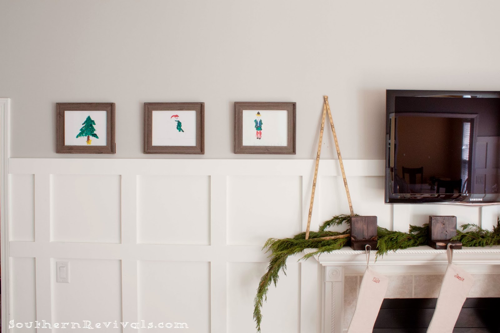 The framed artwork was a team effort by my oldest and his dad. Dad did the drawing and B did the painting. They are my favorite holiday works of art.