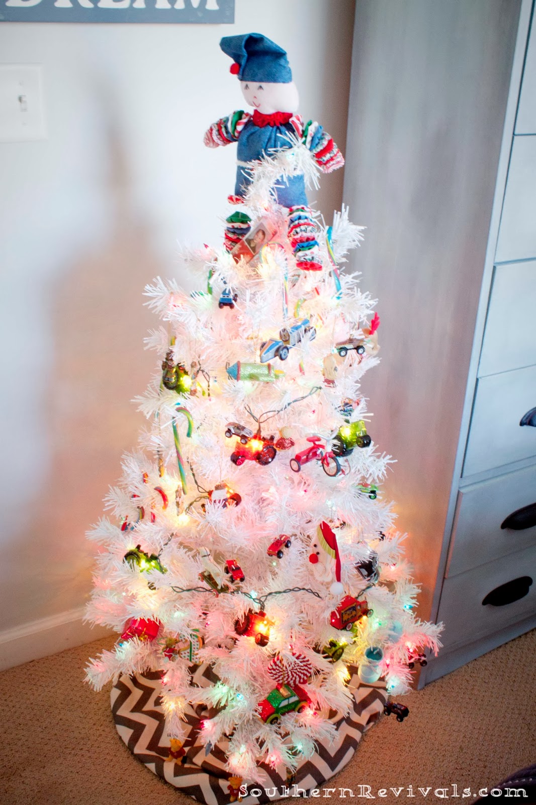 He has his own tree too but it’s not as full as big brother’s yet. Also, instead of bubble lights he has tractor lights because that’s how he rolls.