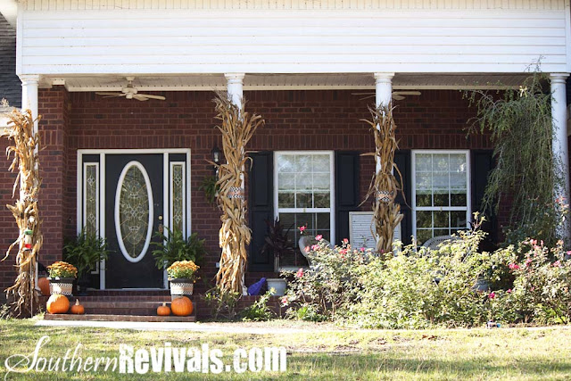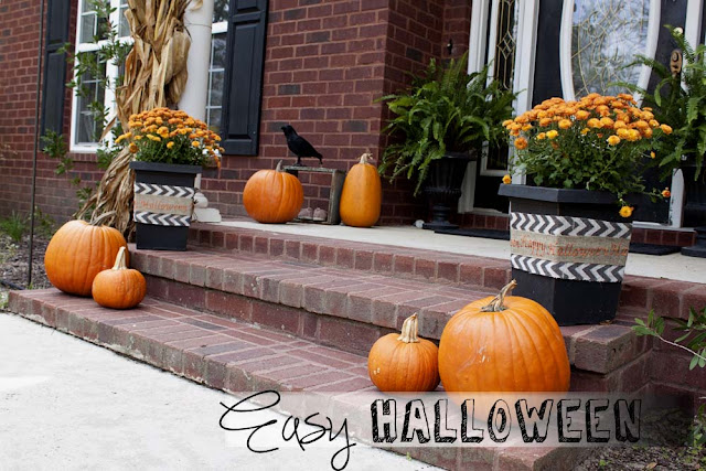 I took that one roll, all 15 yards, and wrapped it around everything. Added some ‘Happy Halloween’ burlap around it on the planters and some fun ribbon around it on the cornstalks.