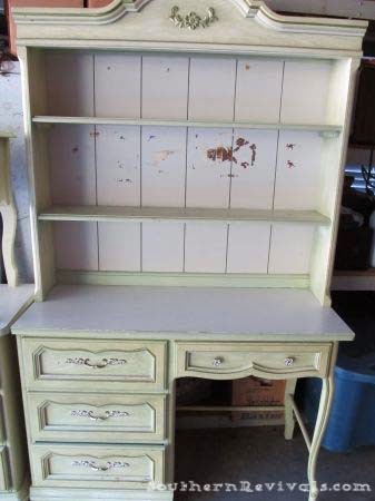 Here’s another of my French Provincial desk and hutch revivals. This one was done in Coral, Gray and Silver. To see more on this piece, including it’s sister piece – A Dresser to Buffet Revival – click here!