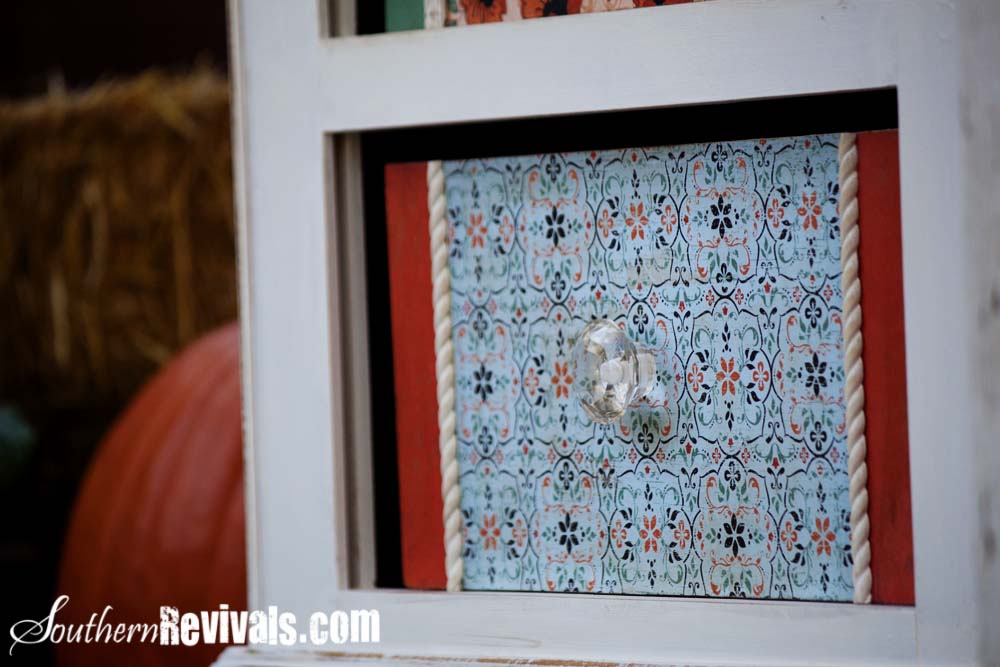 I added a coordinating pattern to the bottoms drawers and some glass knobs on both.