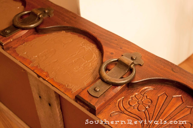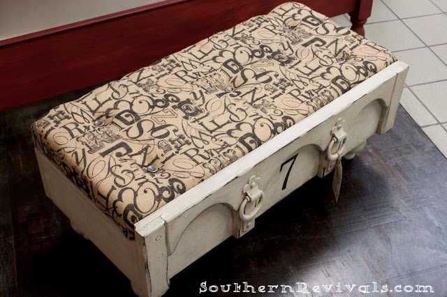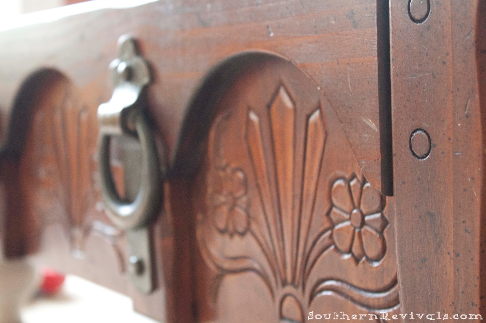 So. You remember I told you about that drawer I removed from a chest of drawers because of it’s heavily carved flower motif, circa 1980? Well, this is the story of a Chest of Drawers – drawer – that became an ottoman.