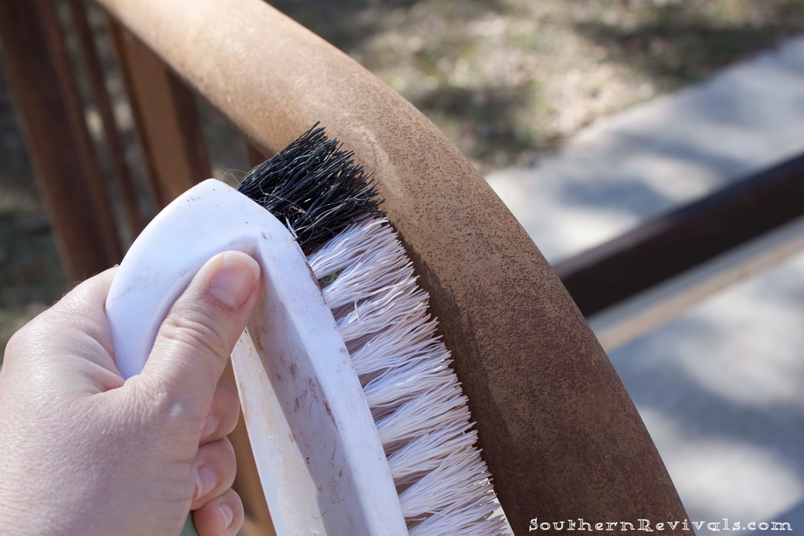 Wiping down rusty metal with a wet cloth is like trying to clean up sugar with honey. It is pointless and it just doesn’t work. Trust me. I tried. Then I just busted out a dry cleaning brush and knocked off as much of the dust as I could, being careful not to remove the patina.